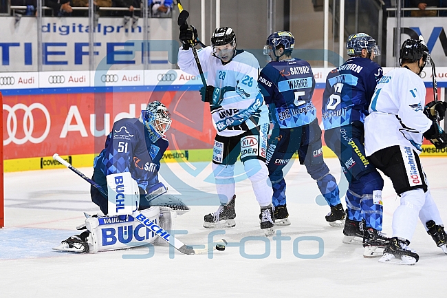 Beschreibung: Mark McNeill (Nr.28, Black Wings Linz) und Fabio Wagner (Nr.5, ERC Ingolstadt) vor Torwart Timo Pielmeier (Nr.51, ERC Ingolstadt), ERC Ingolstadt gegen Black Wings Linz am 08.09.2019 in Ingolstadt,