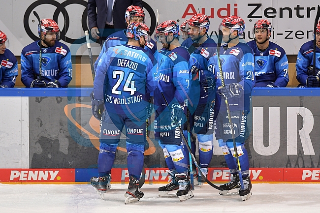Brandon DeFazio (Nr.24 - ERC Ingolstadt), Colton Jobke (Nr.7 - ERC Ingolstadt)m David Elsner (Nr.61 - ERC Ingolstadt) und Emil Quaas (Nr.20 - ERC Ingolstadt), ERC Ingolstadt gegen Augsburger Panther am 13.12.2020 in Ingolstadt. Foto: Johannes TRAUB / JT-Presse.de